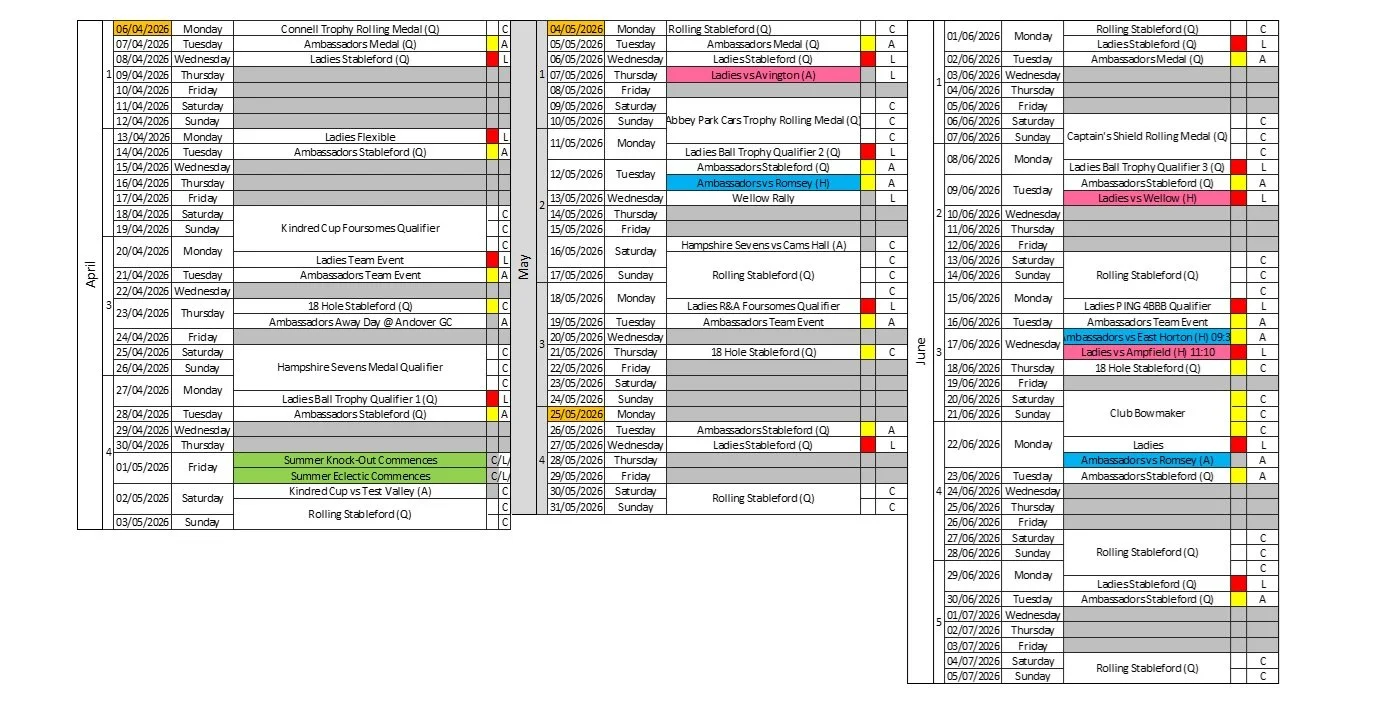Qualifiers to enter both the Kindred Cup and the Hampshire Sevens will be happening over the next few weekends. If you are looking to participate in these competitions, please ensure you take part in the qualifiers (Kindred Cup qualifier weekend of 18th April, is a Greensomes competition so enter as pairs, and the Hampshire Sevens qualifier will be a medal on the weekend of the 25th of April). These two weekends the usual Club competitions will not be held. There will be no entry fee for these qualifiers.